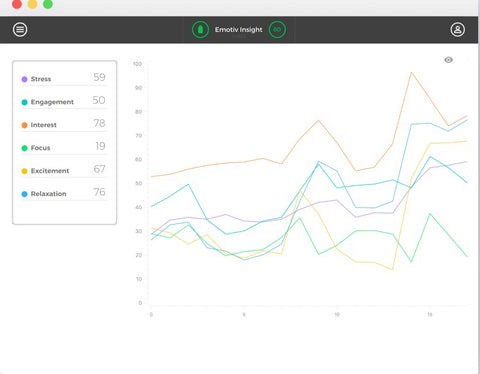 These EMOTIV “detections,” aka Performance Metrics, include Frustration, Interest, Relaxation, Engagement, Excitement, Stress, and Attention. We fine-tune these detections and develop new ones through further testing.