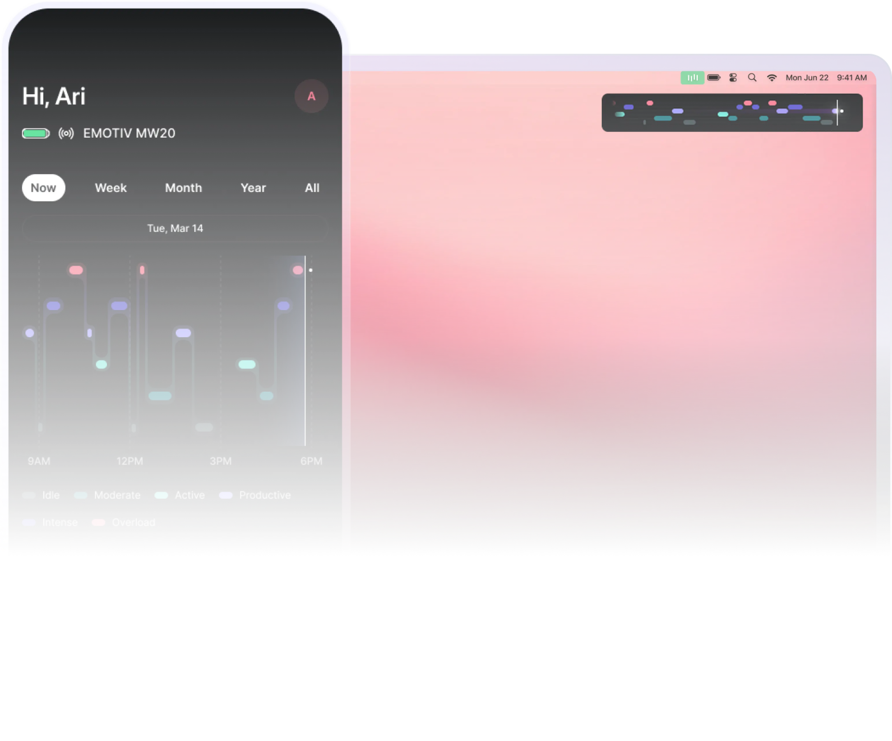 האפליקציה של Emotiv עובדת באופן מקורי עם Emotiv MN8 כדי לעזור לך להבין דפוסים של פוקוס, מתח ועומס קוגניטיבי, ולהתמוך בהתבוננות ואיזון נפשי לאורך זמן.