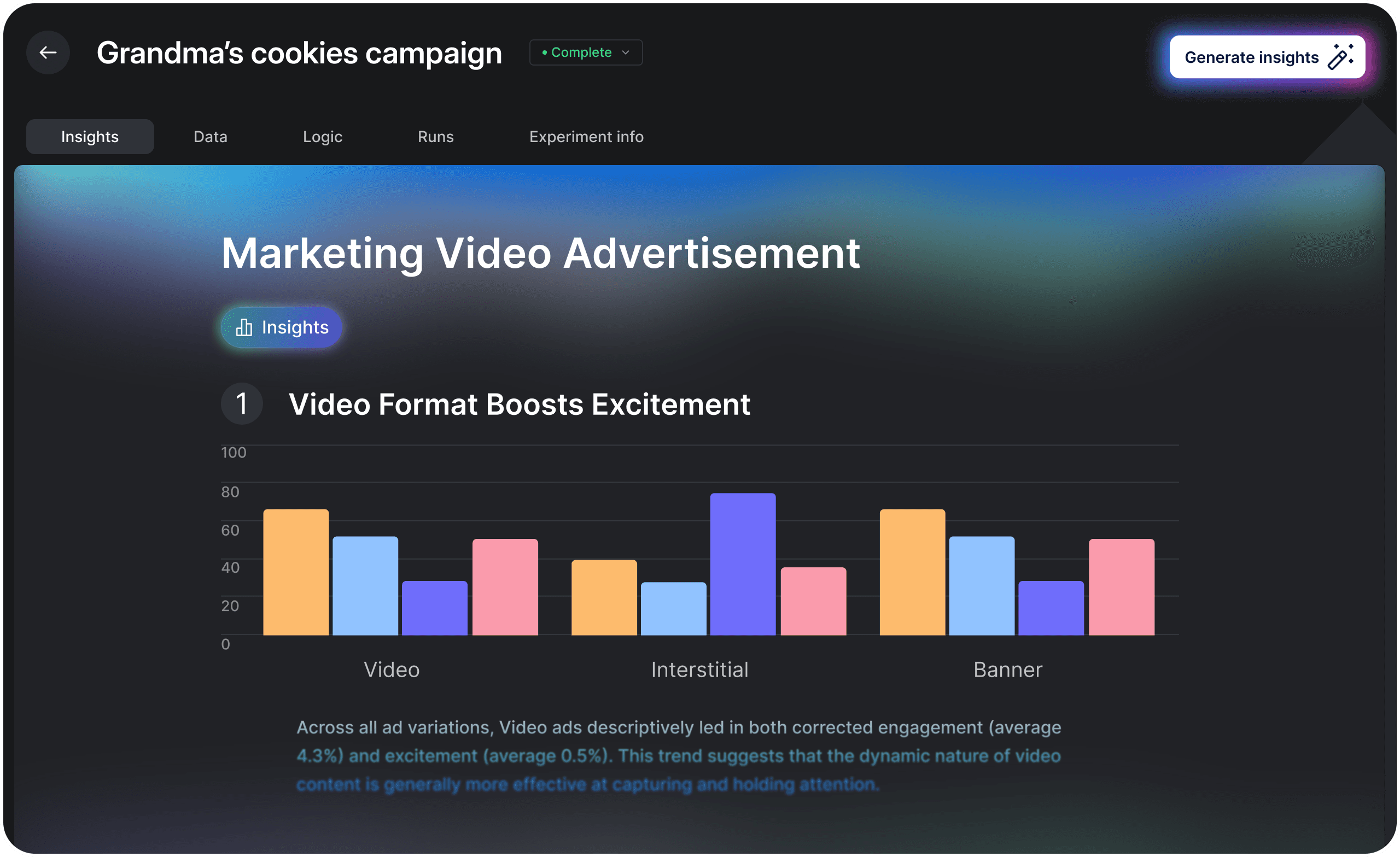 Analisis penelitian tradisional dapat memakan waktu berhari-hari atau berminggu-minggu. Dengan Emotiv Studio, analisis yang didorong oleh AI memberikan wawasan yang siap pakai dalam hitungan menit—membantu Anda menguji variasi, membandingkan arah kreatif, dan mengoptimalkan lebih cepat tanpa mengganggu proses Anda.